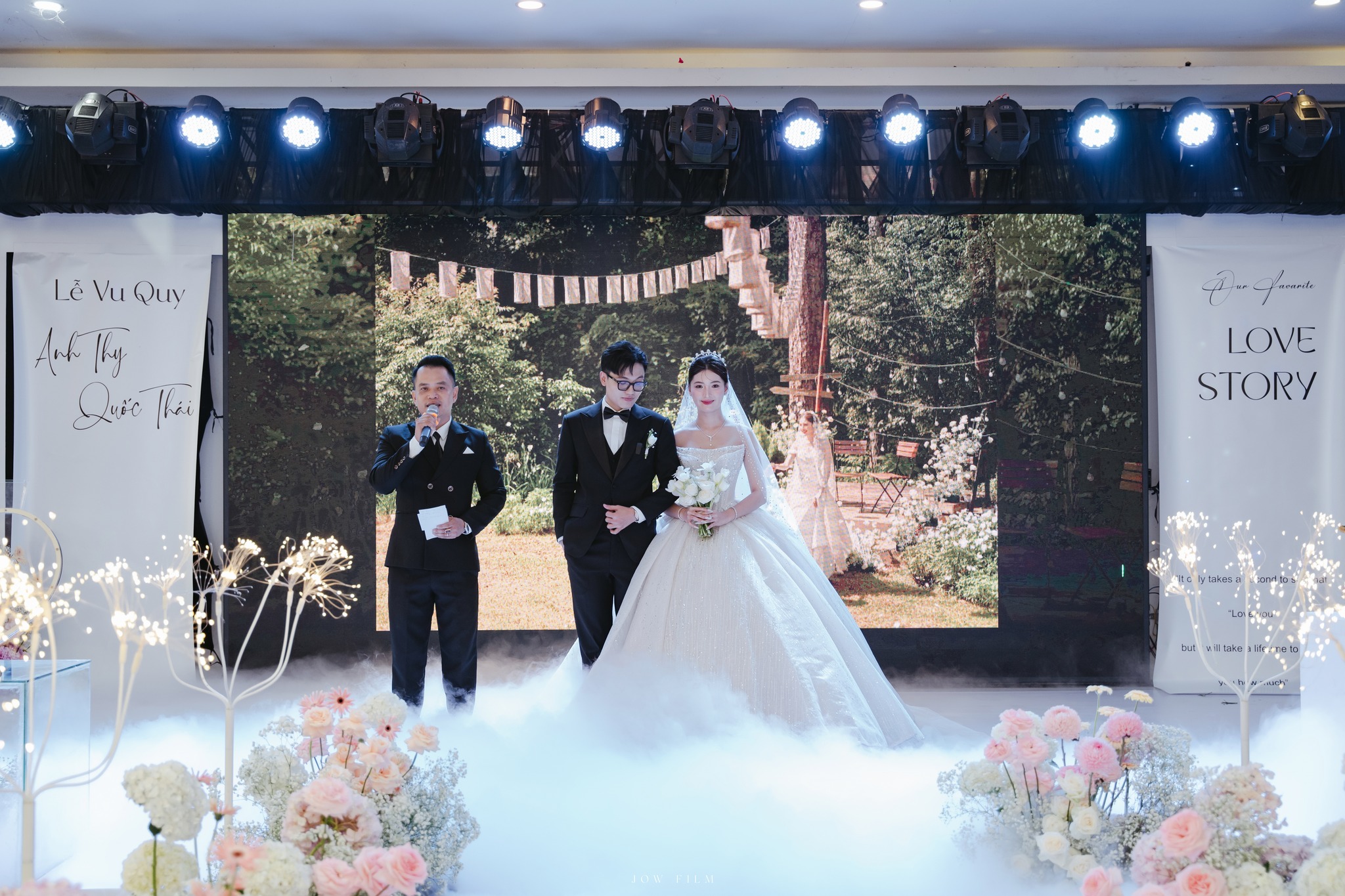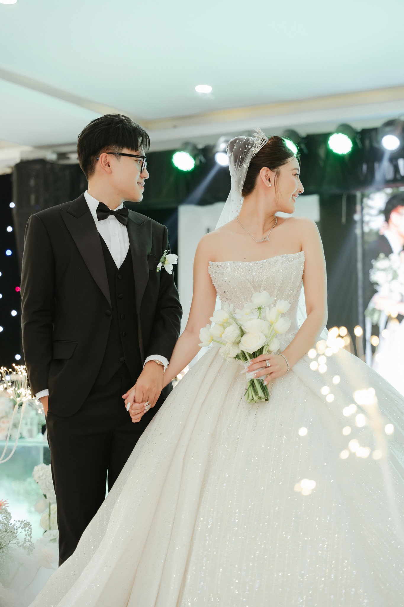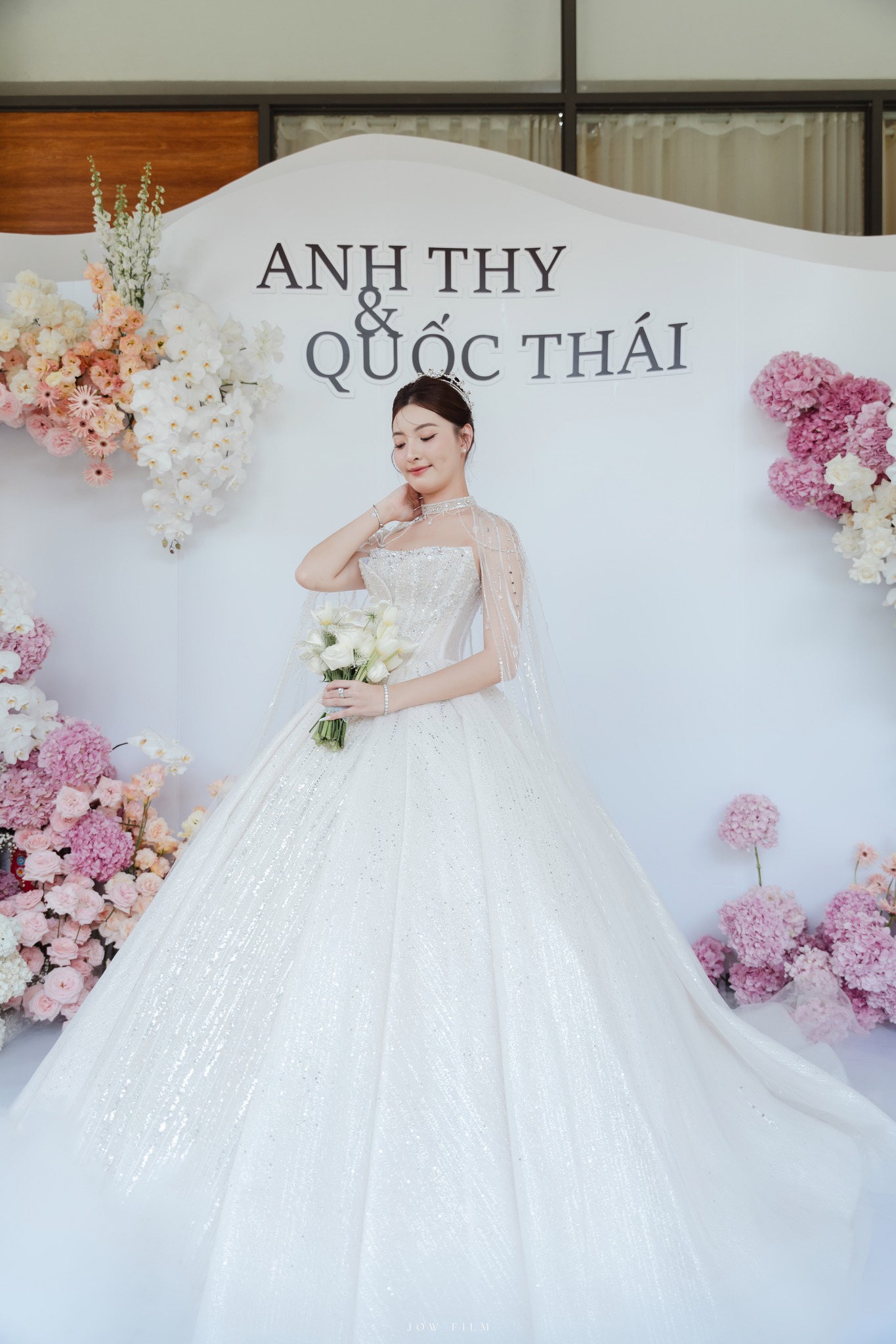 Khi bước đi trên lễ đường, trong ánh sáng lấp lánh và tiếng nhạc du dương, Anh Thy không chỉ là cô dâu – cô là hiện thân của tình yêu đong đầy và viên mãn. Chiếc váy Ball Gown lộng lẫy, từng hạt ngọc trai và pha lê bắt lấy ánh sáng, phản chiếu vẻ đẹp của một người phụ nữ hạnh phúc vì được yêu đúng cách.