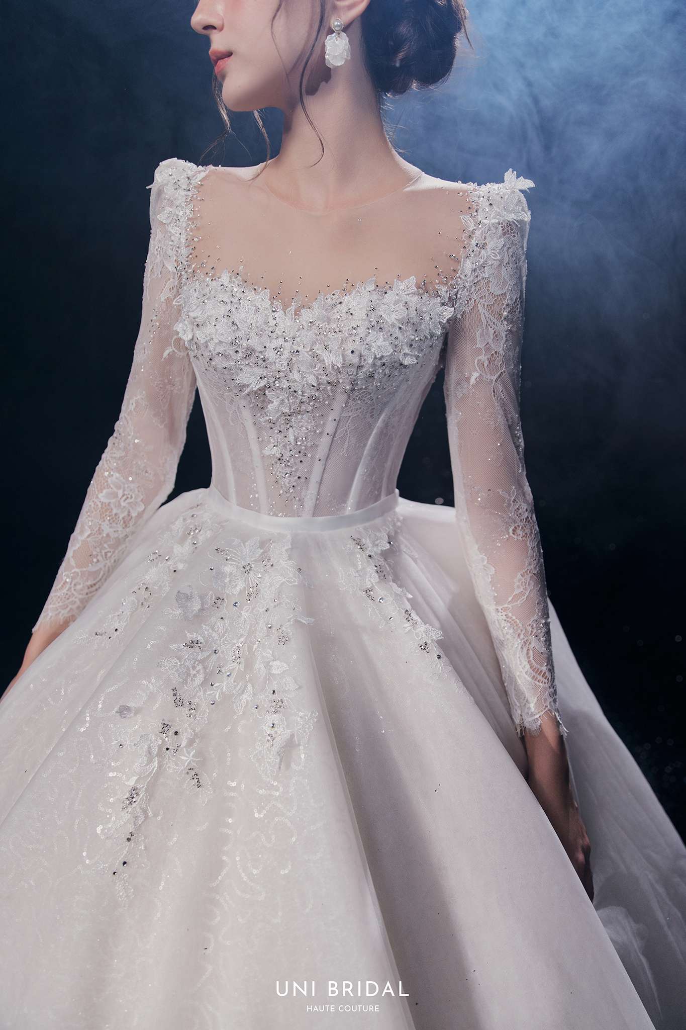- Tay áo dài hoặc tay phồng nhẹ: Gợi lên nét cổ điển và giúp cô dâu thêm phần kín đáo nhưng vẫn quyến rũ.