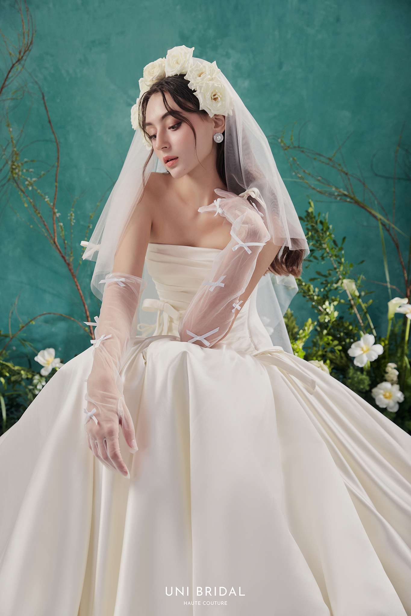 Luôn chú trọng việc lựa chọn chất liệu cao cấp, Uni Bridal đảm bảo rằng mỗi chiếc váy cưới đều có độ bền đẹp, mềm mại và dễ chịu. Đặc biệt, việc sử dụng các loại ren, lụa, và vải tulle cao cấp sẽ tạo nên một vẻ đẹp nhẹ nhàng, thanh thoát nhưng không kém phần sang trọng. Những chất liệu này cũng giúp chiếc váy dễ dàng “kể” được câu chuyện tình yêu của cô dâu trong suốt ngày trọng đại.
