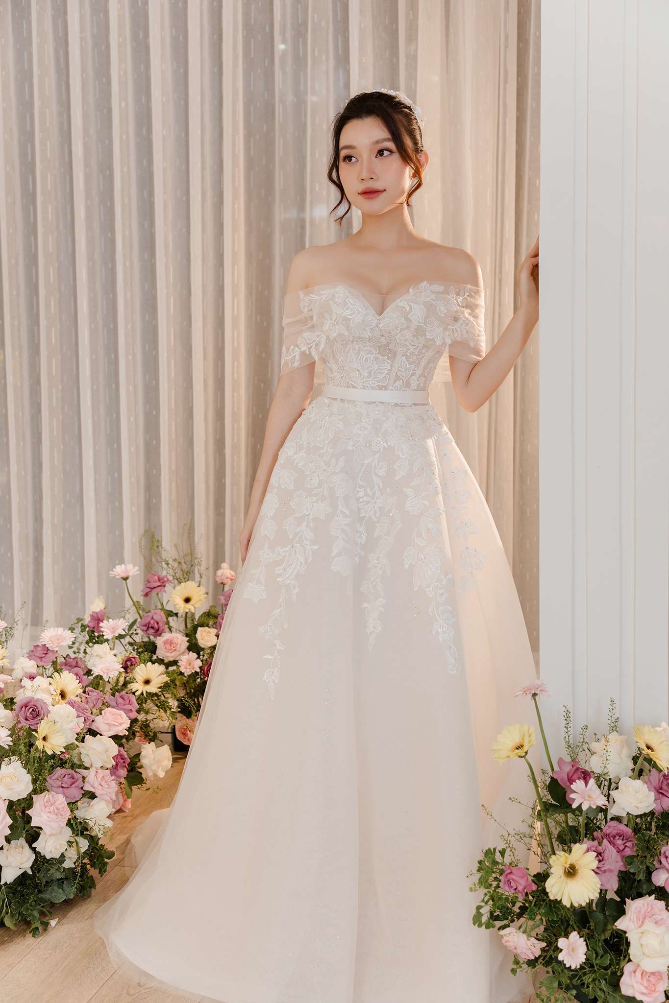 Dáng người cao gầy mang đến nhiều lợi thế, đặc biệt là dễ dàng thử nghiệm với các thiết kế cầu kỳ hoặc bồng bềnh. Tuy nhiên, để cân đối vóc dáng, một chiếc váy cưới phù hợp cần thêm điểm nhấn làm nổi bật đường nét mềm mại.