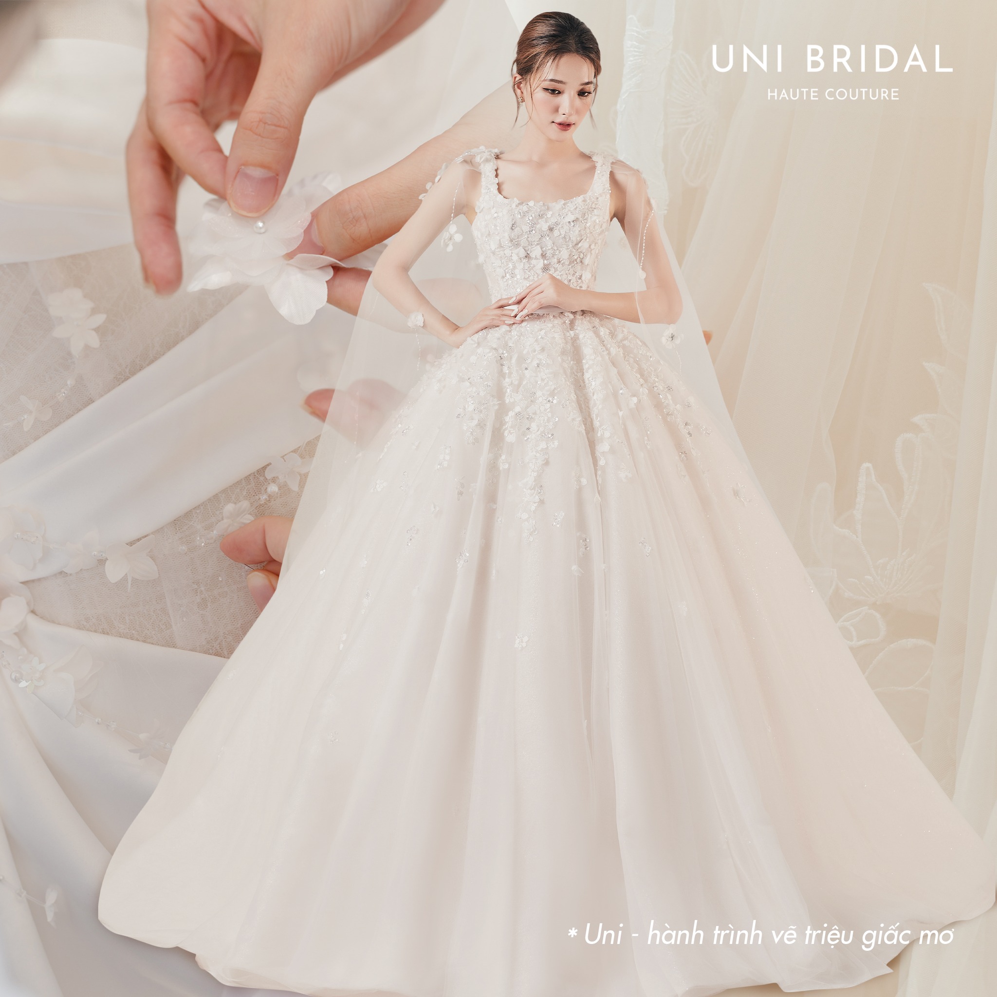 Uni Bridal tự hào mang đến những chiếc váy cưới độc bản, được thiết kế riêng biệt cho từng cô dâu, giúp bạn tự tin, rạng rỡ và tạo nên dấu ấn đặc biệt trong ngày trọng đại của mình. Chúng tôi cam kết không chỉ là người tạo ra chiếc váy cưới, mà là người đồng hành cùng bạn trong hành trình biến giấc mơ cưới thành hiện thực, từng bước, từng chi tiết.