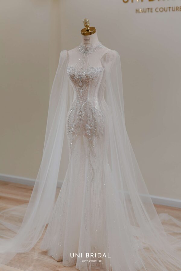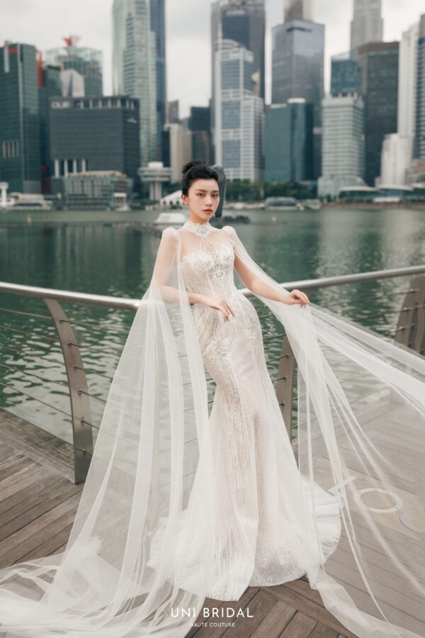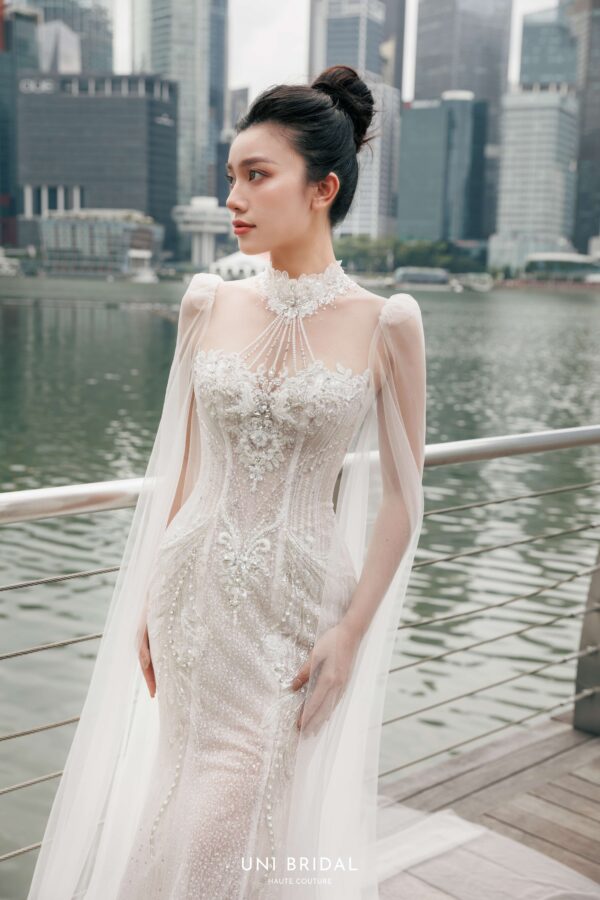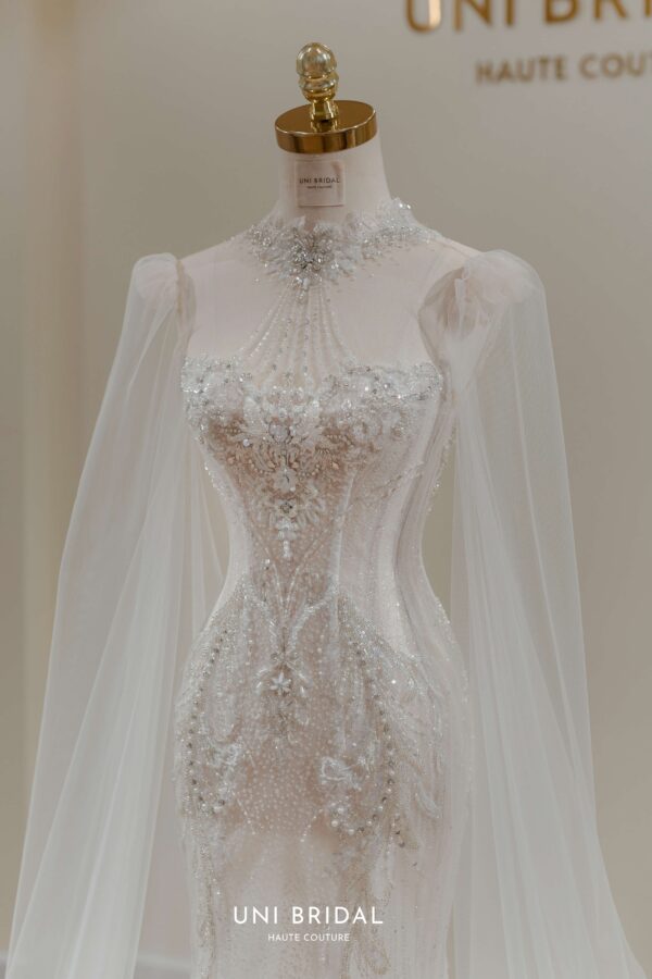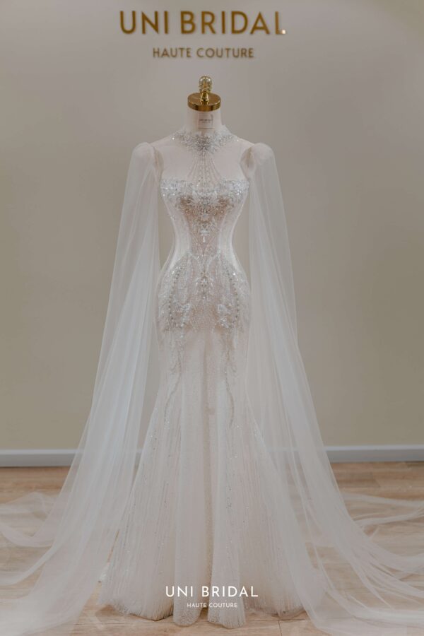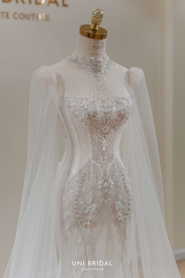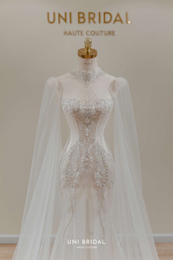 Phần áo choàng voan thả dài, mang đến vẻ đẹp vừa cổ điển vừa hiện đại. Chi tiết cổ cao được cách điệu nhẹ nhàng, giúp cô dâu thêm phần thanh thoát và kiêu sa. Đây là sự lựa chọn hoàn hảo cho những cô dâu yêu thích phong cách sang trọng, quyến rũ và muốn tạo dấu ấn khó quên trong ngày trọng đại.