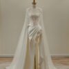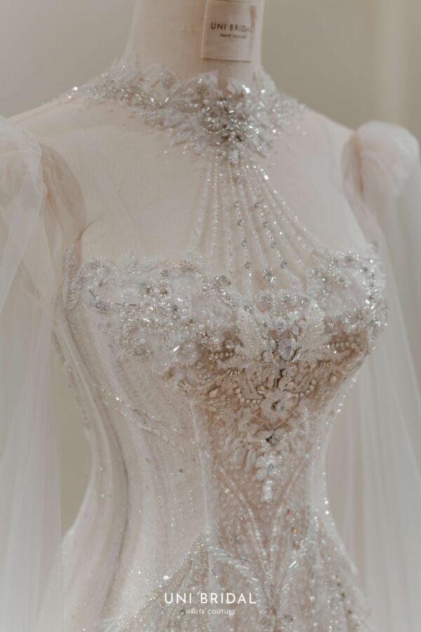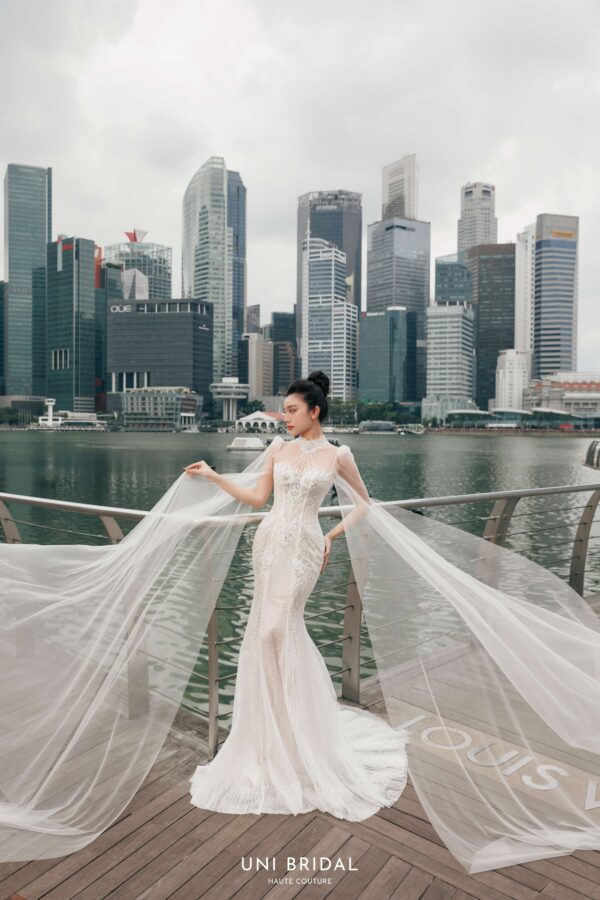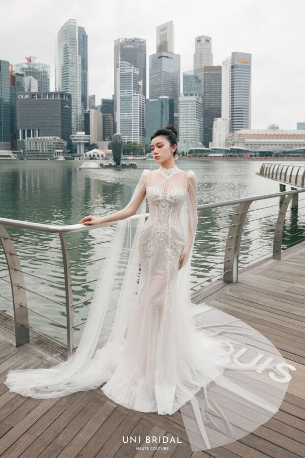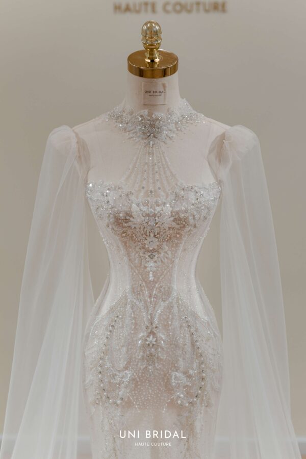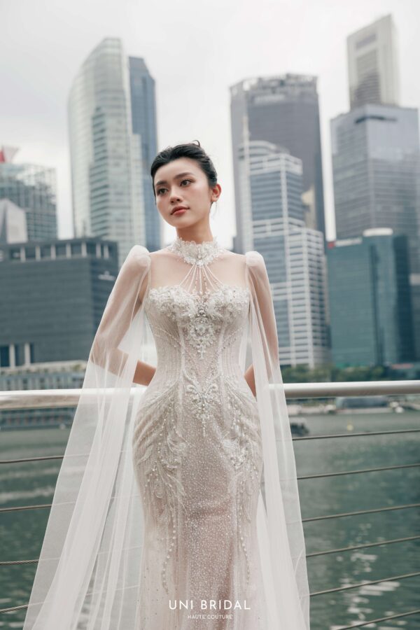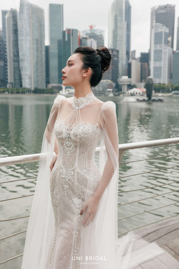 Phần áo choàng voan thả dài, mang đến vẻ đẹp vừa cổ điển vừa hiện đại. Chi tiết cổ cao được cách điệu nhẹ nhàng, giúp cô dâu thêm phần thanh thoát và kiêu sa. Đây là sự lựa chọn hoàn hảo cho những cô dâu yêu thích phong cách sang trọng, quyến rũ và muốn tạo dấu ấn khó quên trong ngày trọng đại.