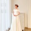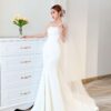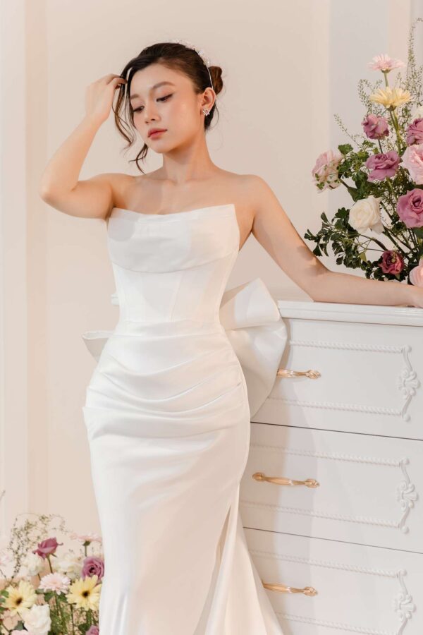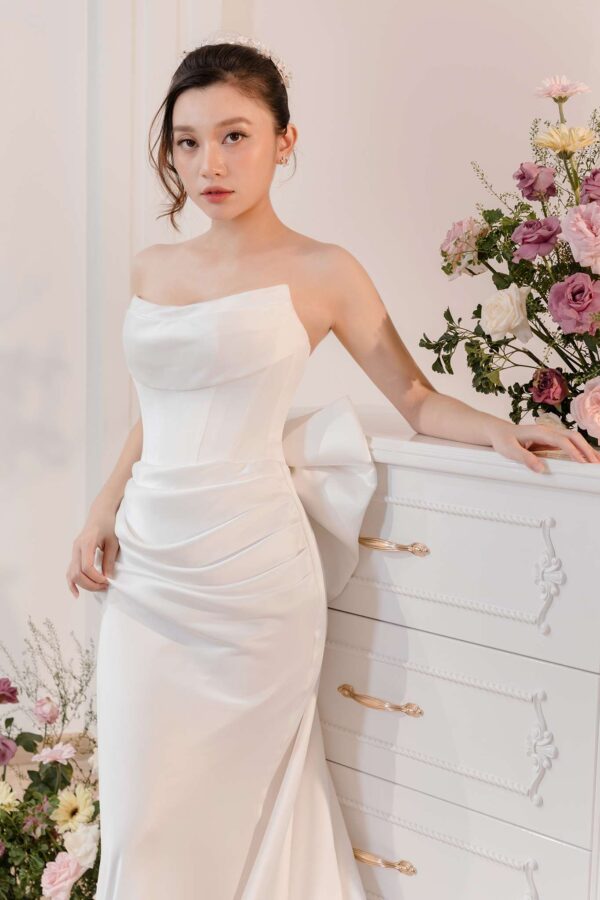 Được làm từ chất liệu lụa cao cấp, mẫu váy đi bàn này mang lại vẻ mềm mại và bay bổng đầy cuốn hút. Với form dáng trumpet tôn lên đường cong quyến rũ, cùng thiết kế cúp ngực gợi cảm, chiếc váy không chỉ tỏa sáng khi bạn bước đi mà còn khiến mọi ánh nhìn dõi theo từng chuyển động. Điểm nhấn ấn tượng nhất chính là chiếc nơ to bản phía sau lưng, vừa tạo cảm giác ngọt ngào vừa là chi tiết trang trí đầy nghệ thuật, giúp bạn thêm phần nổi bật trong không gian tiệc cưới.