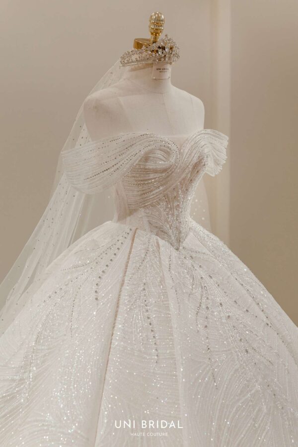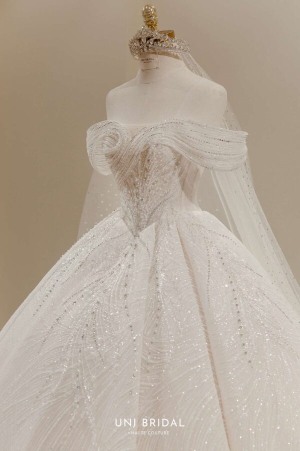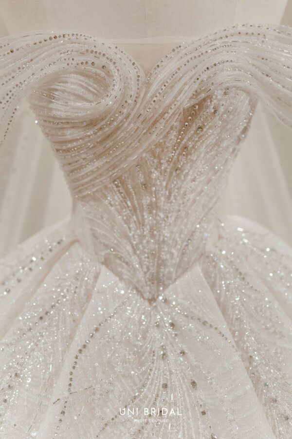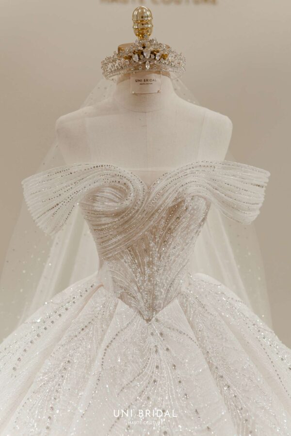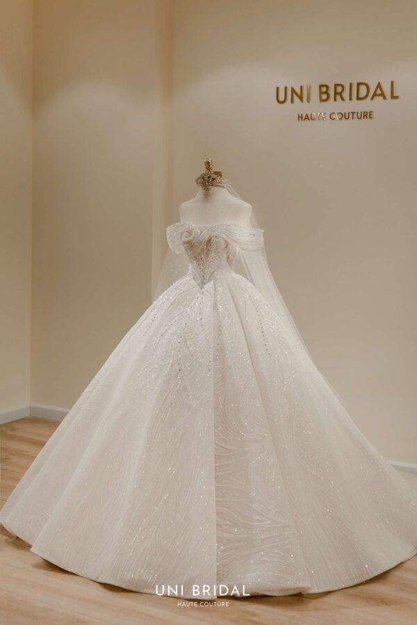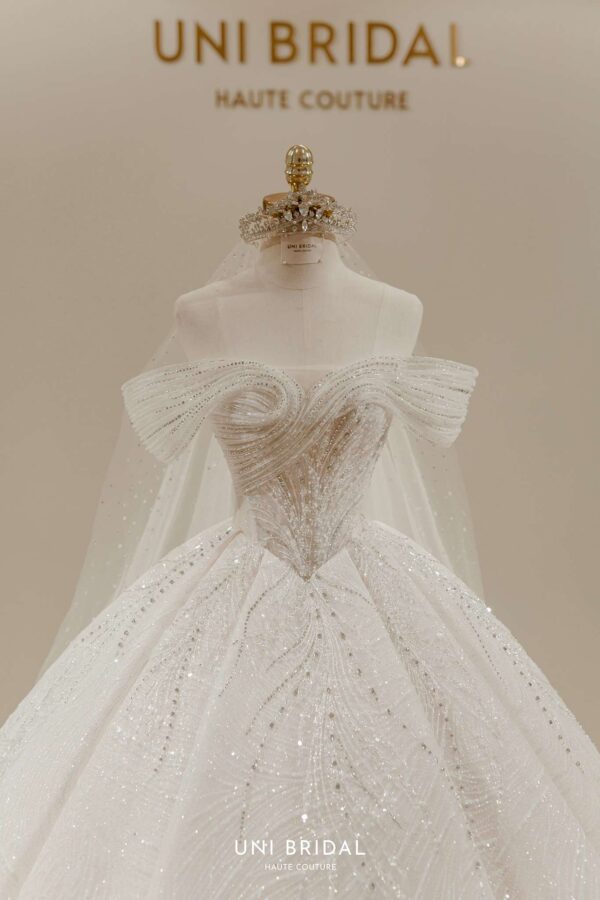 Váy cưới đi lễ của Uni Bridal với điểm nhấn chính là phần thân váy được đính kết thủ công với chi tiết ánh kim lấp lánh, tạo hiệu ứng như những vì sao trên nền trời đêm. Phần cổ áo trễ vai xếp ly mềm mại kết hợp với chi tiết xuyên thấu nhẹ nhàng càng làm tăng thêm nét yêu kiều. Đây là sự lựa chọn hoàn hảo cho một cô dâu muốn tỏa sáng trong khoảnh khắc thiêng liêng nhất của cuộc đời.