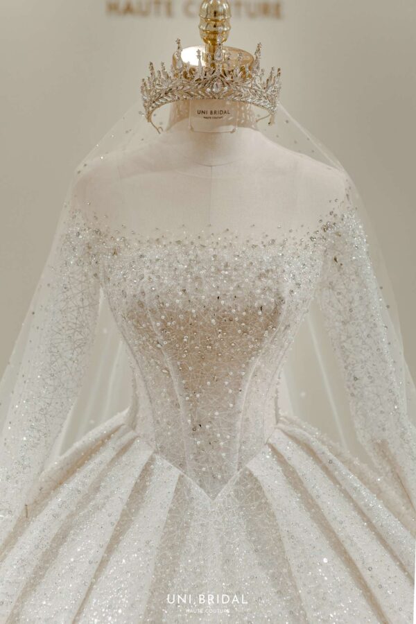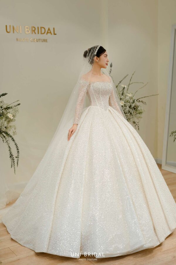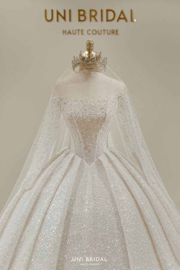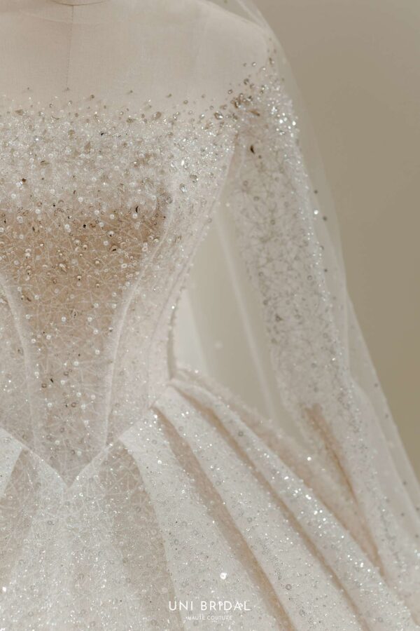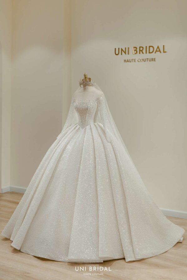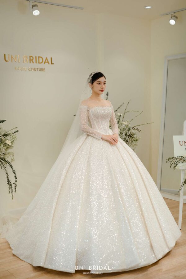 Mẫu váy cưới này từ Uni Bridal sở hữu dáng váy bồng cổ điển, mang đến vẻ đẹp hoàng gia đầy quyền quý. Chất liệu chính được sử dụng là vải ánh kim cao cấp, kết hợp cùng các lớp lưới mỏng nhẹ, tạo hiệu ứng lấp lánh mềm mại như ánh sao. Phần thân váy được thiết kế tỉ mỉ với các đường xếp nếp tinh tế, giúp tăng độ phồng tự nhiên mà vẫn giữ được sự thanh thoát. Tay áo dài xuyên thấu kết hợp chi tiết đính kết thủ công tôn lên vẻ đẹp thanh lịch và kiêu sa cho cô dâu trong ngày trọng đại.