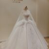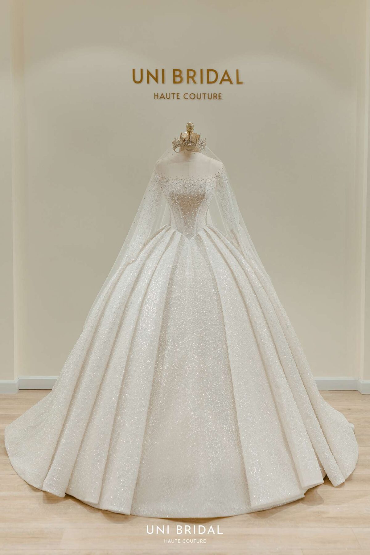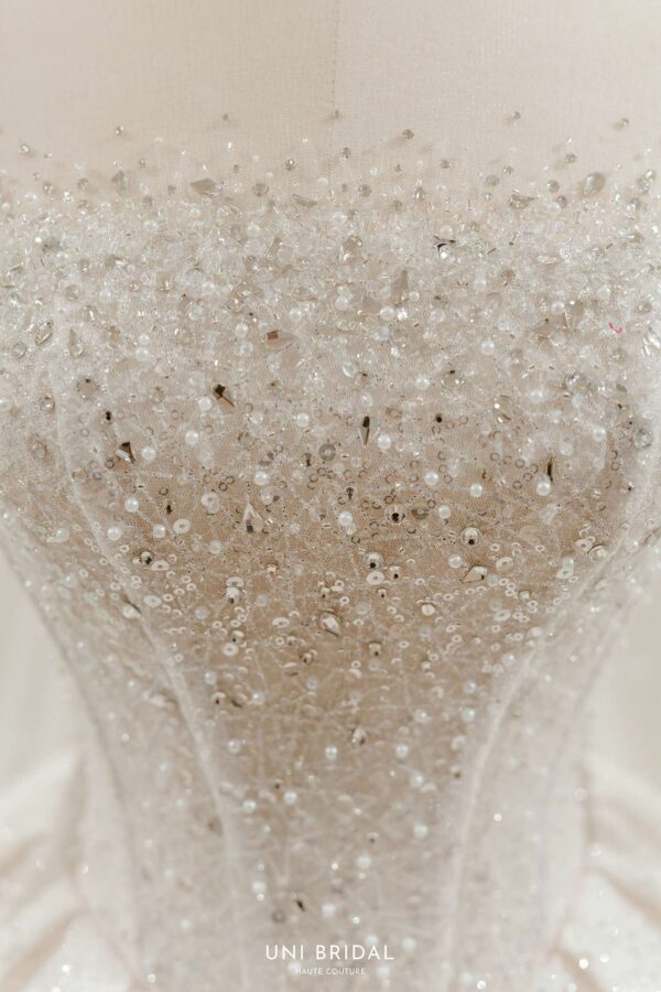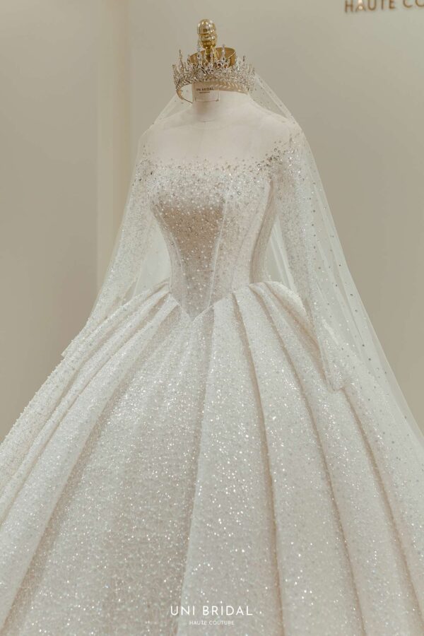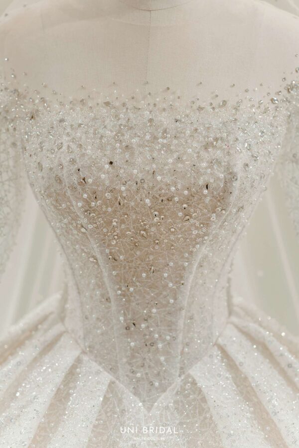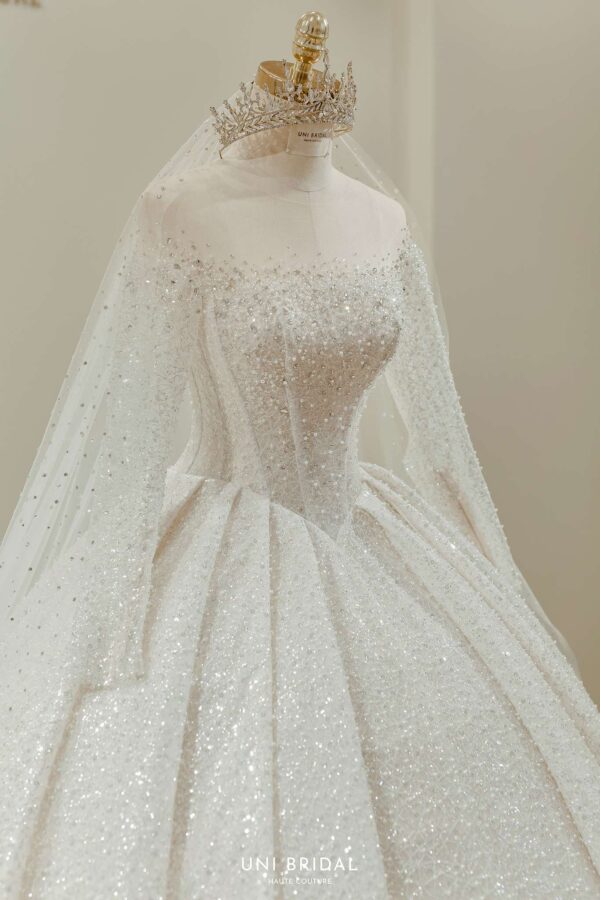 Mẫu váy cưới này từ Uni Bridal sở hữu dáng váy bồng cổ điển, mang đến vẻ đẹp hoàng gia đầy quyền quý. Chất liệu chính được sử dụng là vải ánh kim cao cấp, kết hợp cùng các lớp lưới mỏng nhẹ, tạo hiệu ứng lấp lánh mềm mại như ánh sao. Phần thân váy được thiết kế tỉ mỉ với các đường xếp nếp tinh tế, giúp tăng độ phồng tự nhiên mà vẫn giữ được sự thanh thoát. Tay áo dài xuyên thấu kết hợp chi tiết đính kết thủ công tôn lên vẻ đẹp thanh lịch và kiêu sa cho cô dâu trong ngày trọng đại.