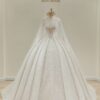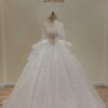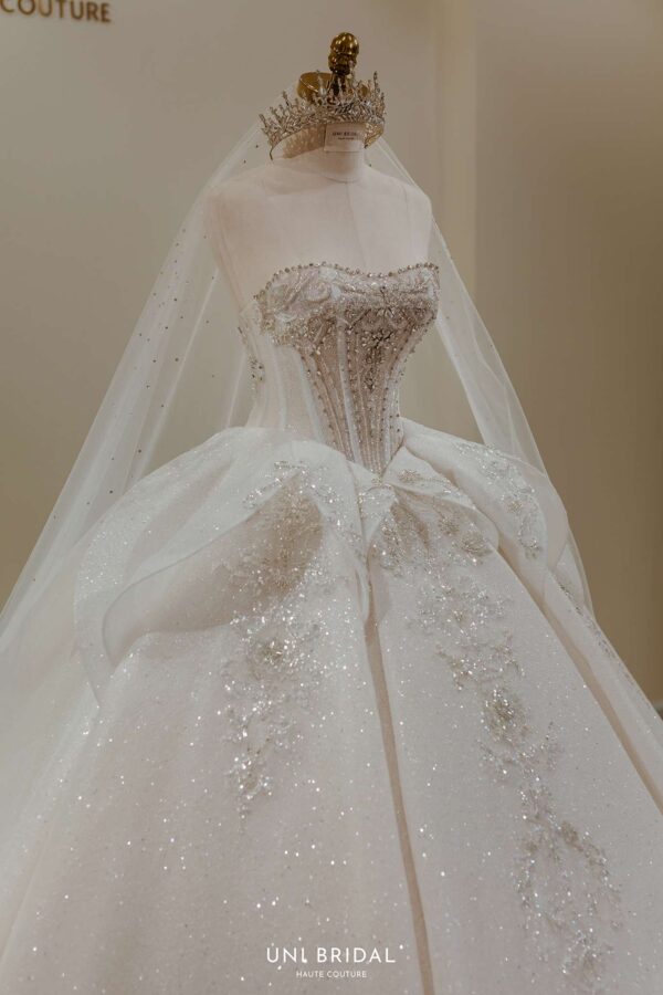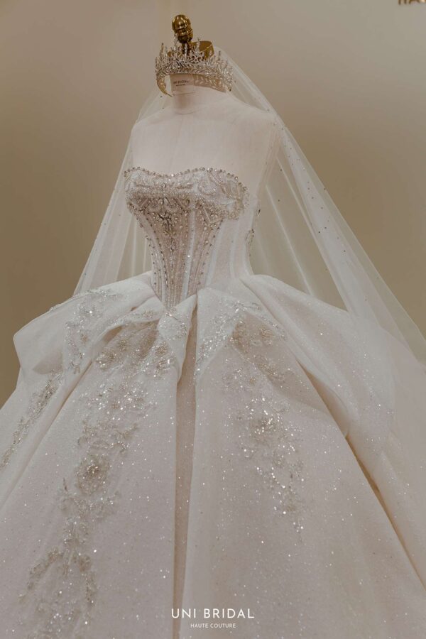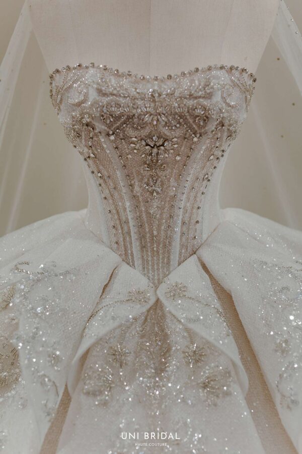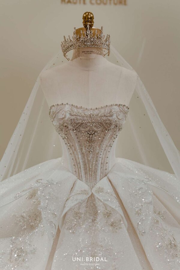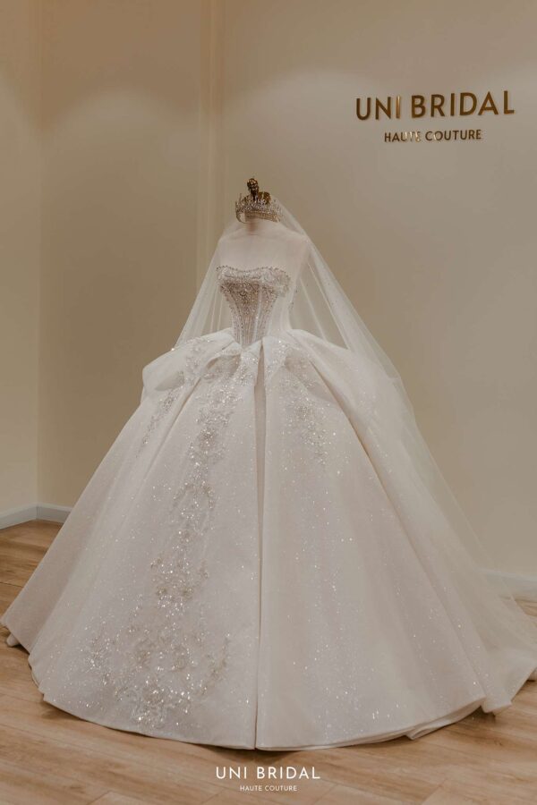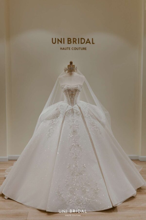 Mẫu váy cưới này từ Uni Bridal được thiết kế theo dáng váy bồng sang trọng, mang đậm phong cách hoàng gia, kết hợp giữa sự kiêu sa và vẻ đẹp hiện đại. Phần thân váy được tạo điểm nhấn bởi chất liệu vải satin ánh kim kết hợp với các họa tiết đính kết pha lê thủ công tỉ mỉ, tạo hiệu ứng lấp lánh đầy quyến rũ. Điểm nổi bật nằm ở phần corset ôm sát thân trên, giúp tôn lên đường nét cơ thể cô dâu một cách tinh tế. Phần chân váy xòe rộng với các chi tiết hoa văn thêu nổi mềm mại, khiến tổng thể thêm phần lộng lẫy và hoàn hảo cho ngày trọng đại.