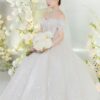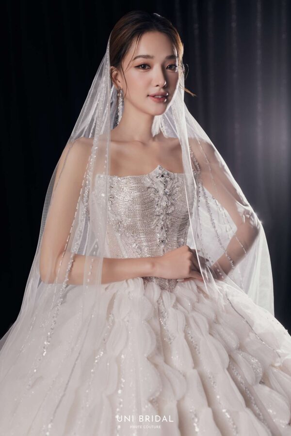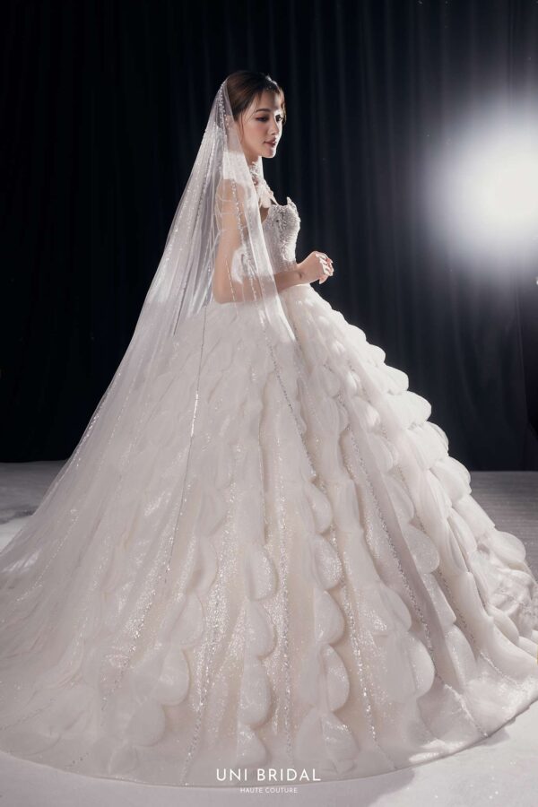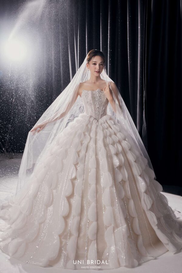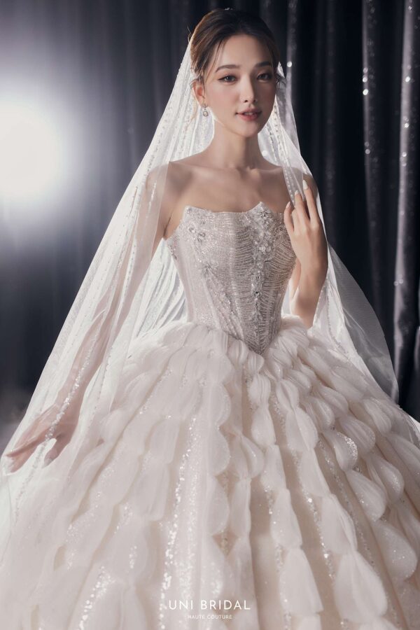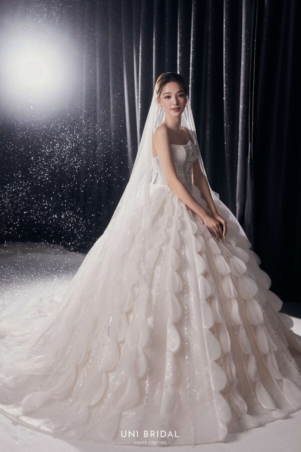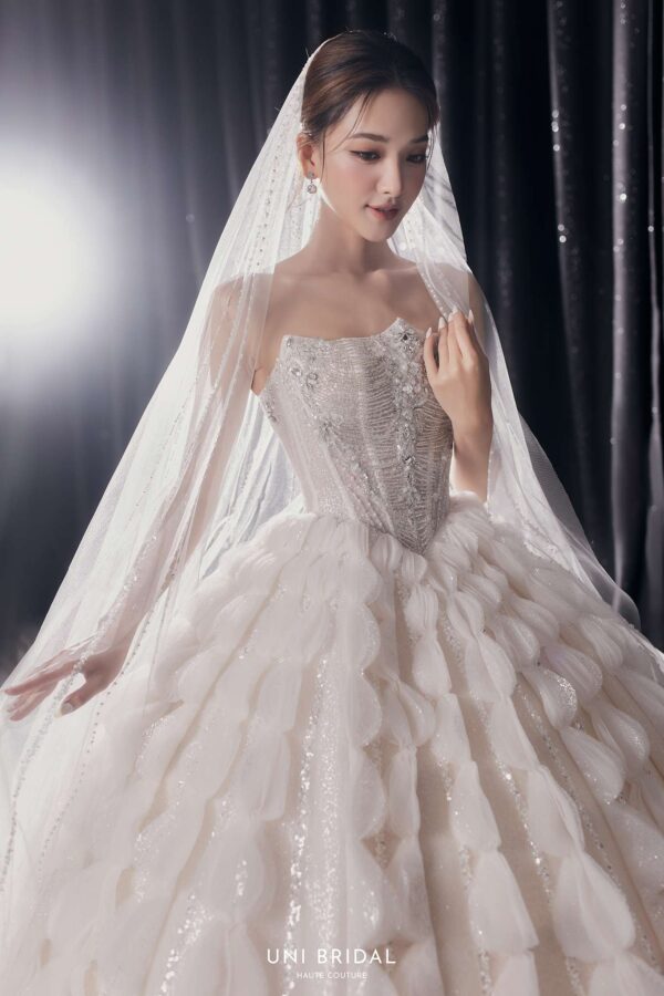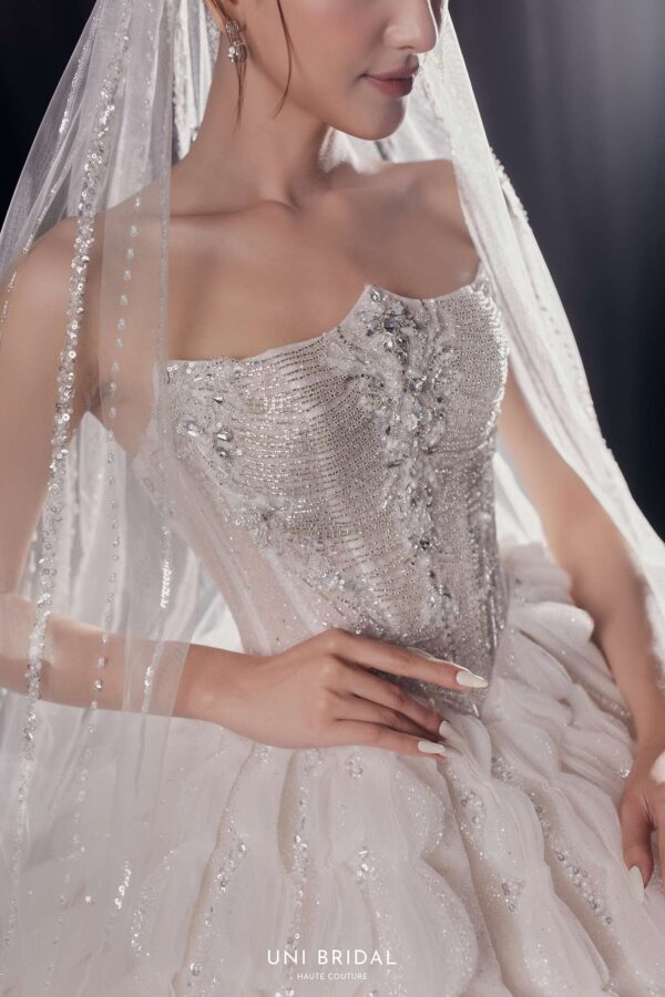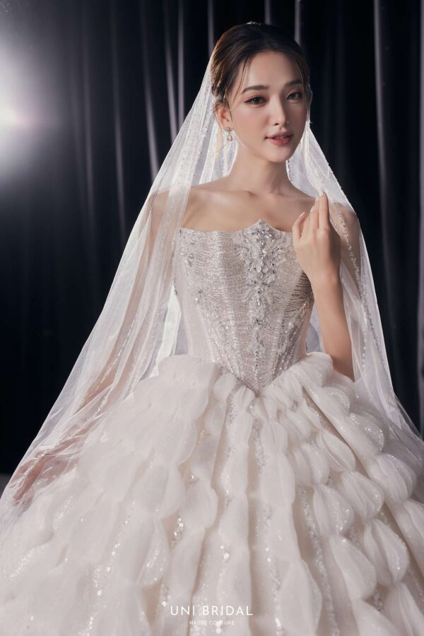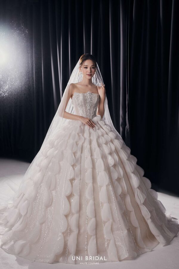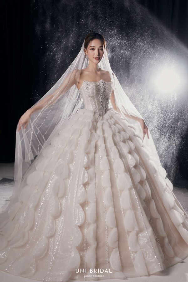 Mẫu váy cưới ball gown này mang phong cách cách điệu với thiết kế họa tiết đối xứng độc đáo, tạo nên sự bồng bềnh, duyên dáng như một nàng công chúa bước ra từ câu chuyện cổ tích. Phần áo corset được chế tác tinh xảo, đính đá lấp lánh, giúp tôn lên vóc dáng thon gọn và mang đến vẻ kiêu sa cho cô dâu. Điểm nhấn hoàn hảo của váy nằm ở lớp voan đi kèm, có thể lựa chọn giữa voan trơn thanh lịch hoặc voan đính đá lấp lánh, mang lại sự mềm mại và lung linh, khiến cô dâu thật nổi bật trong ngày trọng đại.
