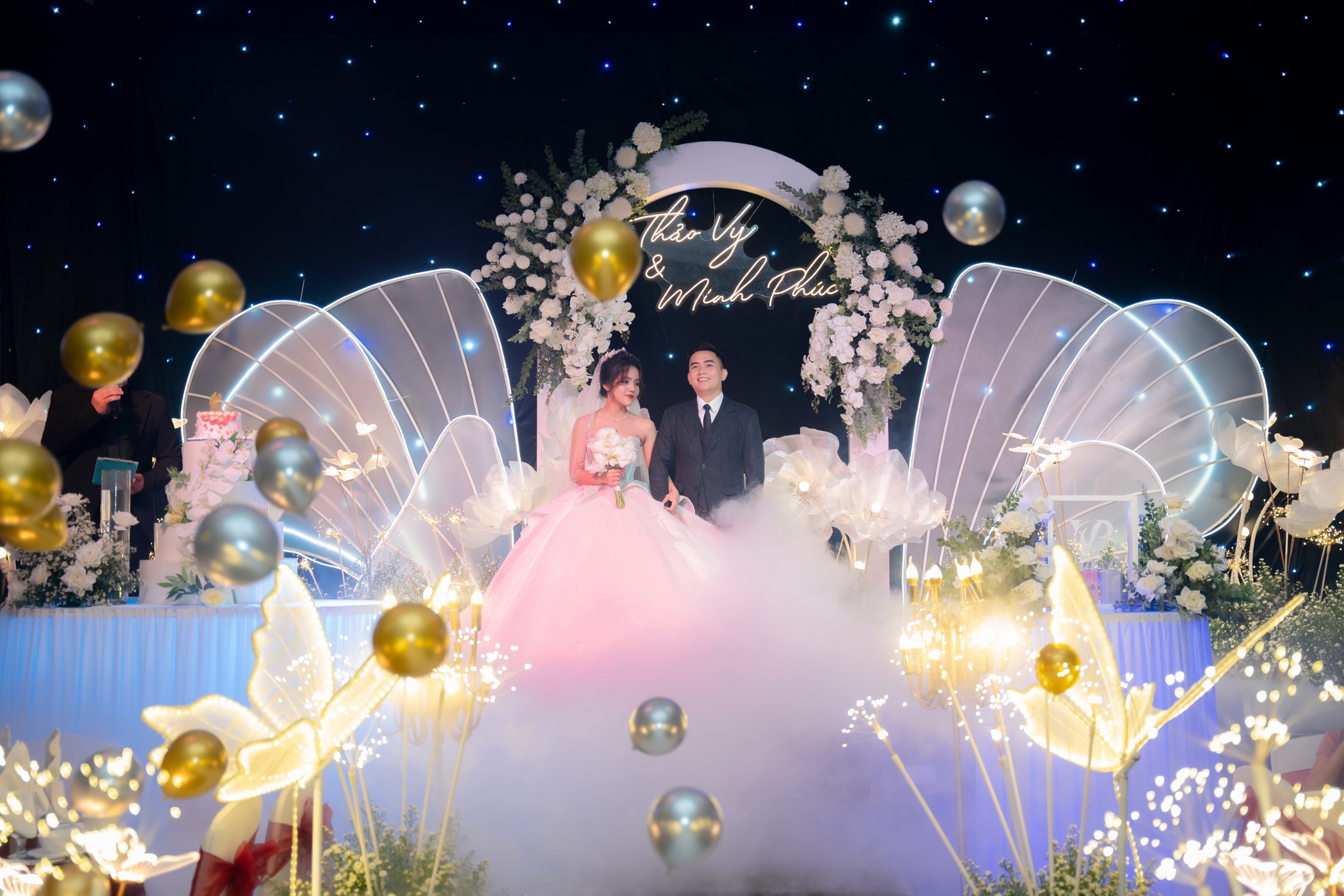 Dưới ánh sáng lung linh của buổi lễ, chiếc váy không chỉ là trang phục mà còn trở thành tâm điểm của mọi ánh nhìn. Từng viên đá nhỏ được đặt thủ công, tạo nên sự huyền ảo, tựa như ánh sao trời điểm tô cho khoảnh khắc trọng đại của Thảo Vy.